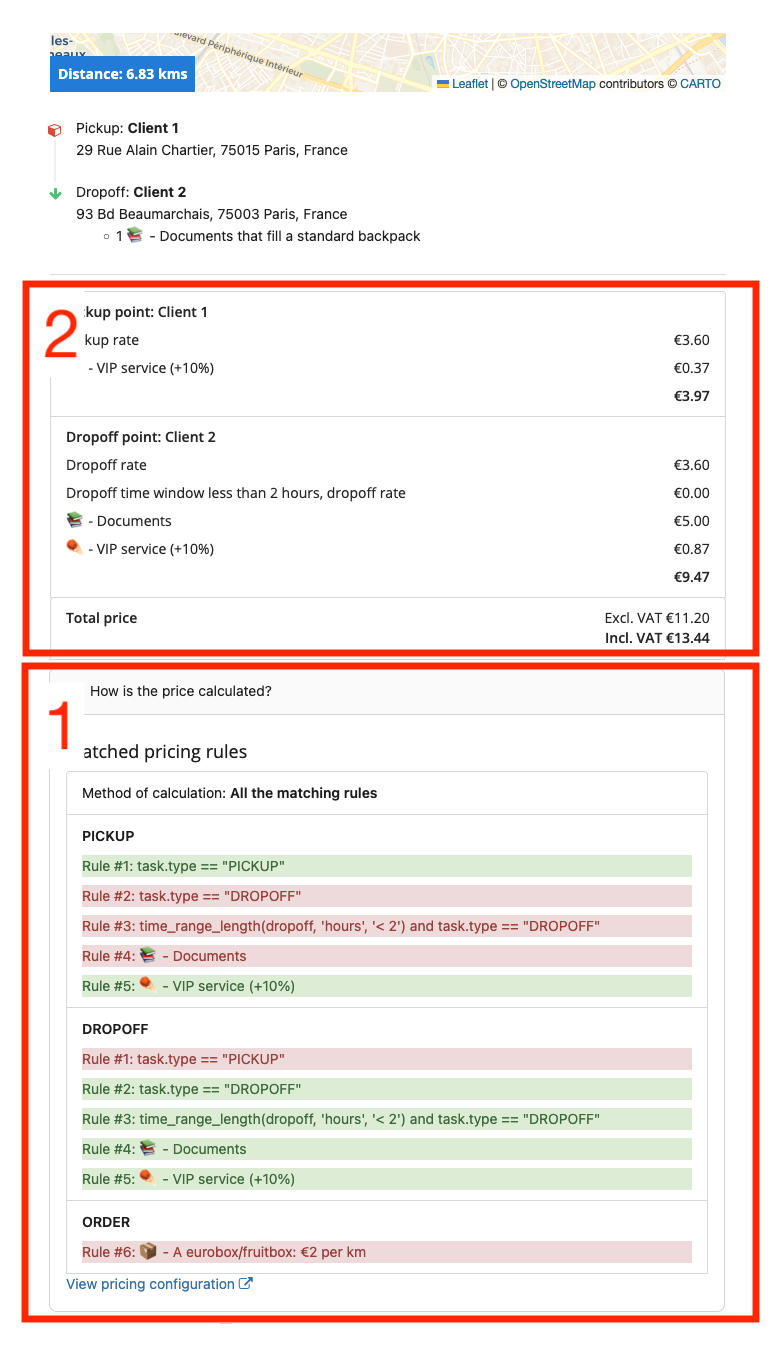 To try the pricing in action, you can use a pricing debug tool. Open a new order page and enter the delivery details and see (1) which pricing rules were evaluated for each point/task and on an entire order (with rules that matched displayed in green) and (2) how the final price was calculated based on the matched rules.